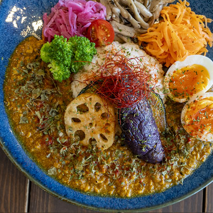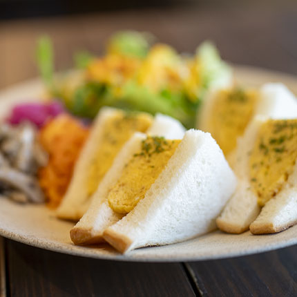オーダーが入ってから巻くだし巻き玉子のサンド。小麦を使用せず、じっくり玉ねぎを炒めた8種のスパイスカレーはランチでのみ。
